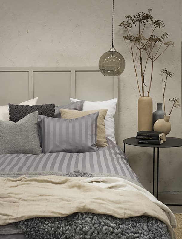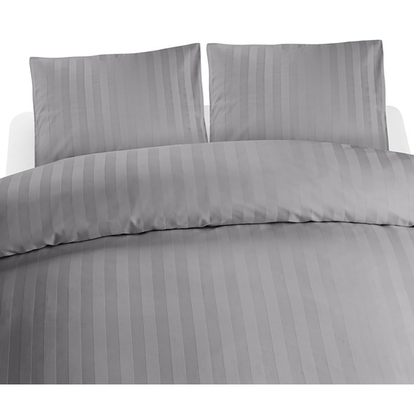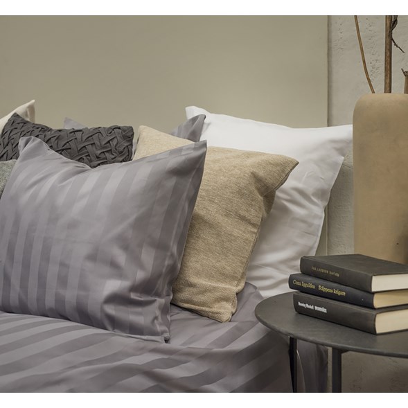 Härligt kingsizepåslakan i elegant ljusgrå randig bomullssatin. Svalt och skönt, som att vakna på Ditt favorithotell varje morgon. Tråden är av kammad bomull.