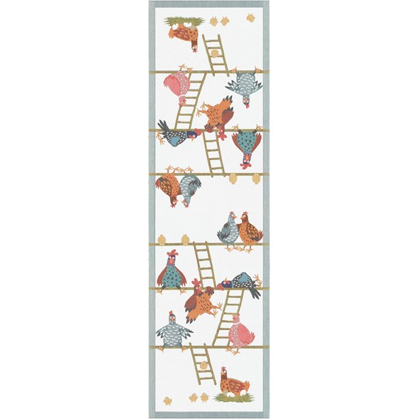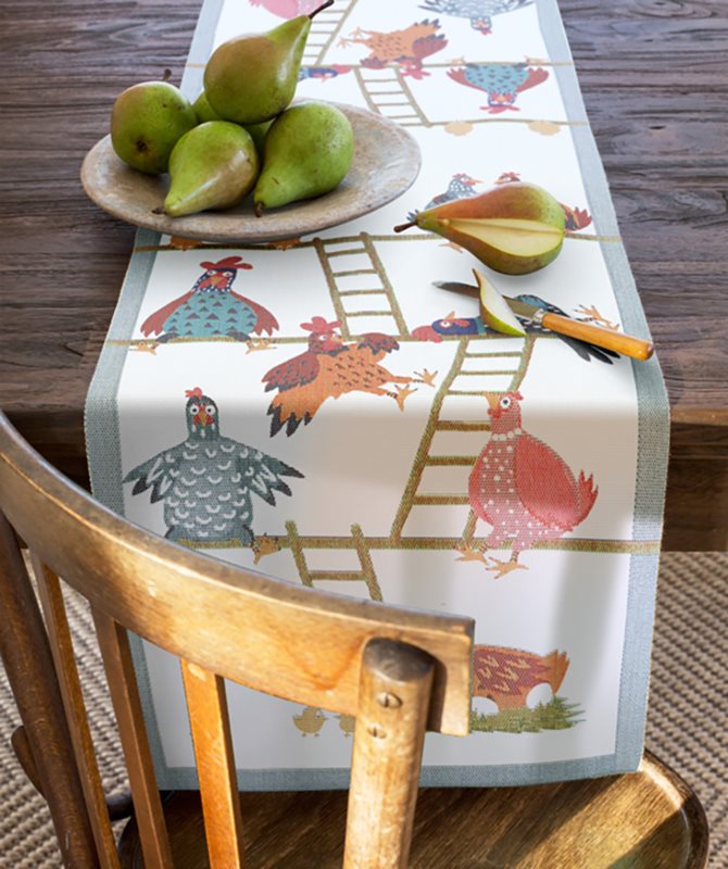 Svensktillverkad med motiv av mångfärgade hönor, tuppar och kycklingar vackert inramad av en ram ton i ton. Ekelunds fina bordslöpare i ekologisk bomull är av högsta kvalitet. Använd den som en viktig inredningsdetalj, eller ge bort den som en fin present.