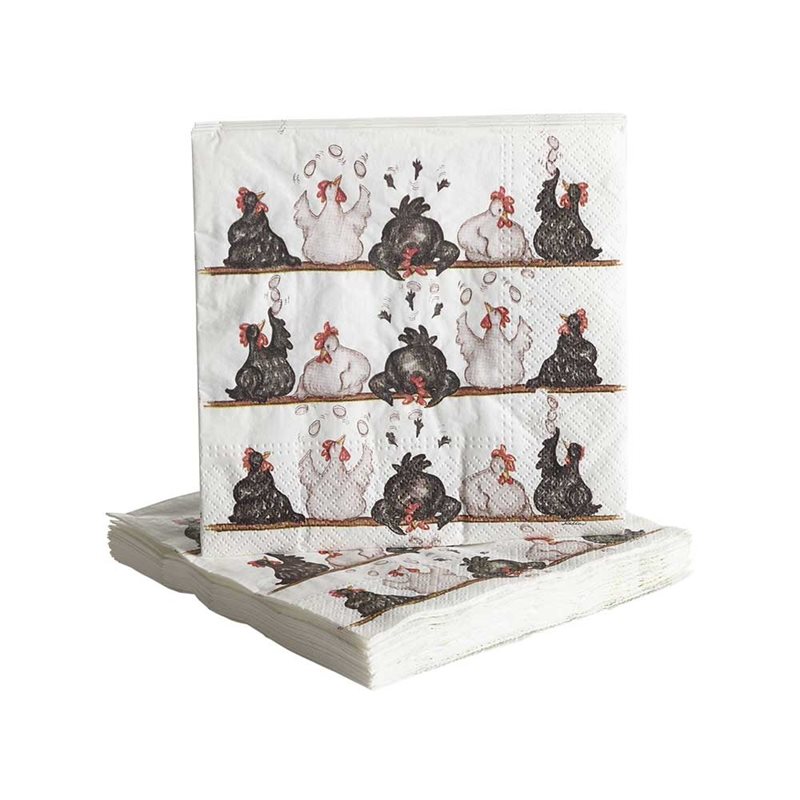 Fina pappersservetter med motiv av roliga hönor. Glatt till påsk. Motivet är handritat av designern Camilla Ståhl.