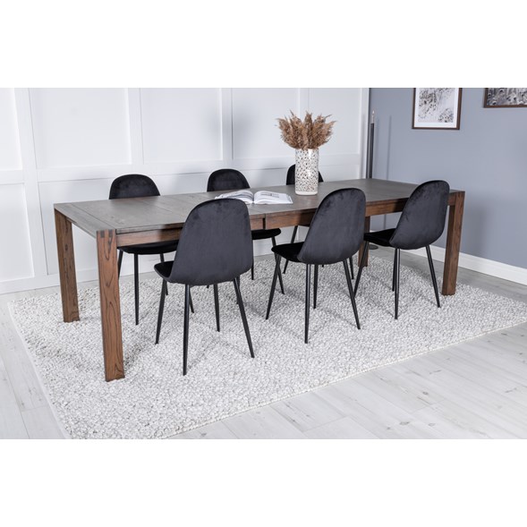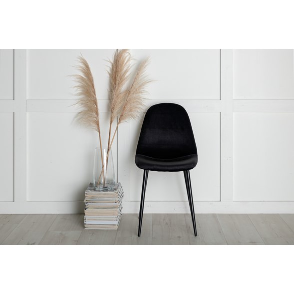 Bekväm matstol från serien Polar har en rundad utformning med klassisk design, lika praktiskt som tidlöst! Rygg och sits i stoppad svart sammetstyg och ben i svart pulverlackerad metall. Den stilrena designen gör stolen enkel att matcha med övrig inredning.