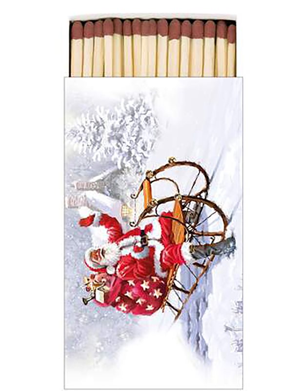 Vacker tändsticksask med långa tändstickor och motiv av jultomten och hans julklappssäck åkandes på en släde.