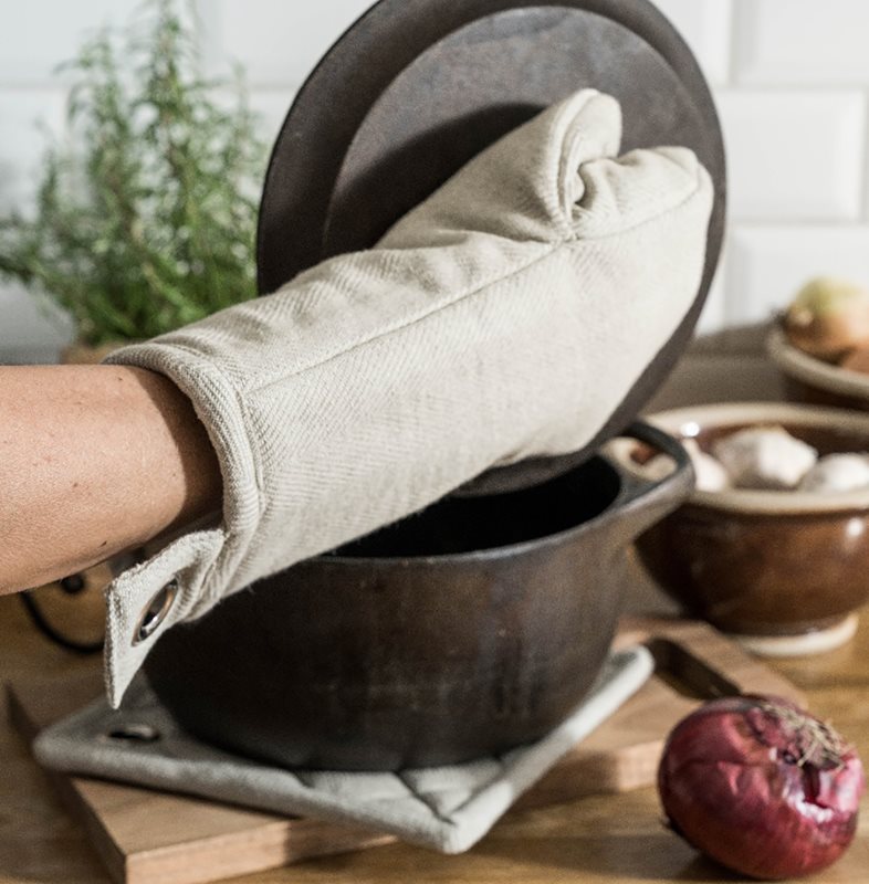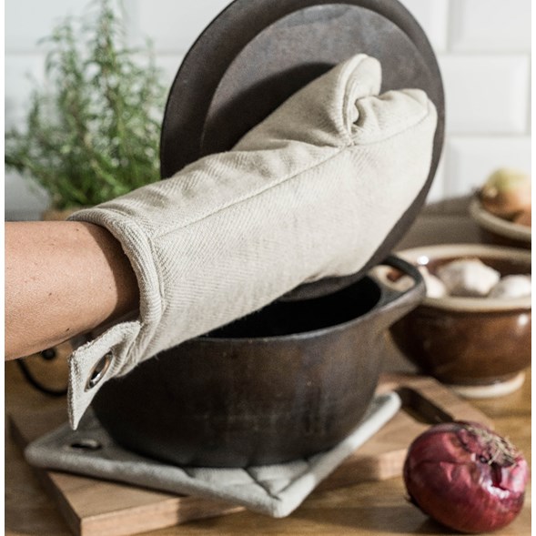 Vävd grillvante i beige fiskbensmönster med snygg öljett.