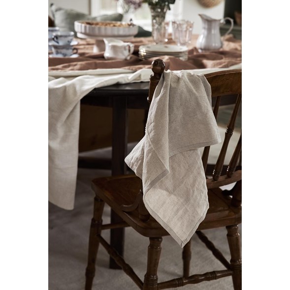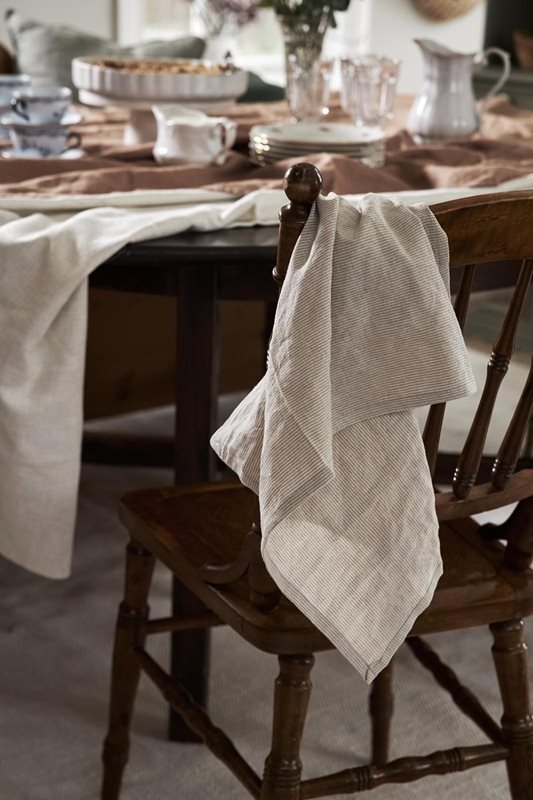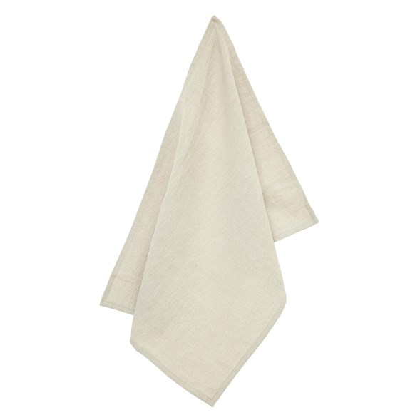 Viken är en beige- och offwhiterandig kökshandduk i en härlig bomull- och lin-blandning.