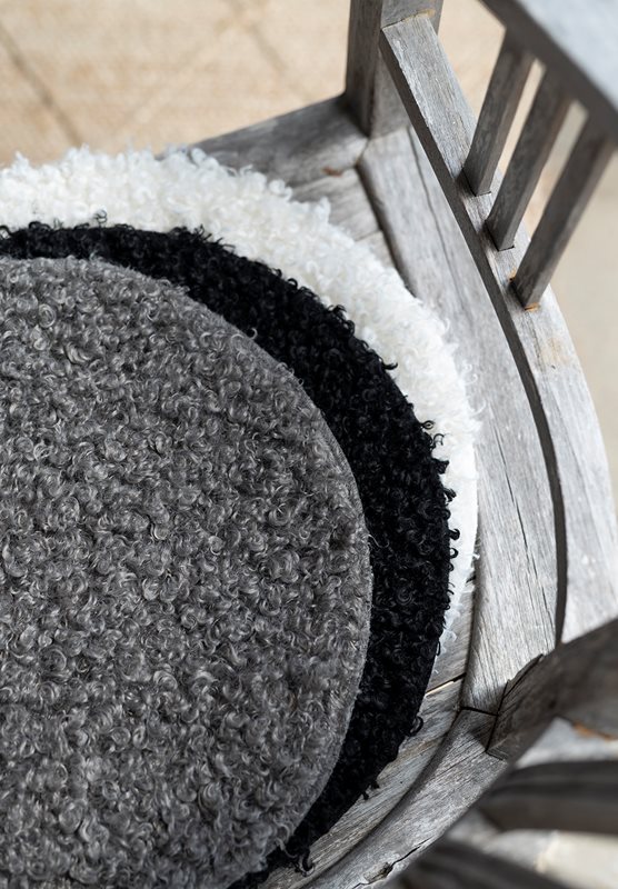 Mjuk gosig sittdyna i grå lammpälsimitation.