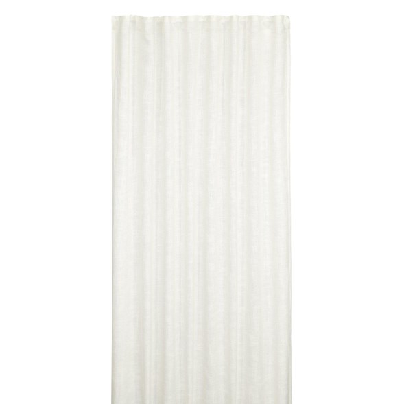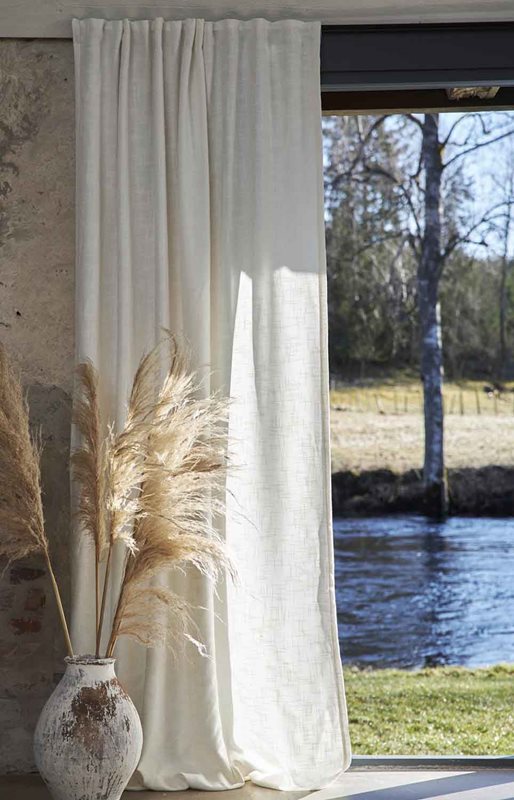 Göran är en härlig offwhitefärgad multibandslängd med slubkvalitet*, vackert fall och ofållad nederkant. Stryk enkelt upp till önskad längd med Nolhaga Hems lättanvända fållband.
