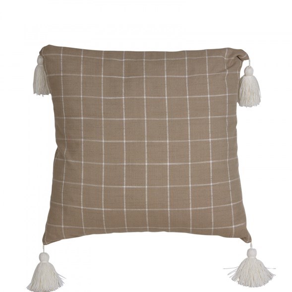 Snyggt kuddfodral i en vacker mörkare linfärg med rutmönster i offwhite på båda sidor. Dekorativa tofsar i offwhite i alla fyra hörnen. Fodralet har en dold dragkedja i nederkanten.