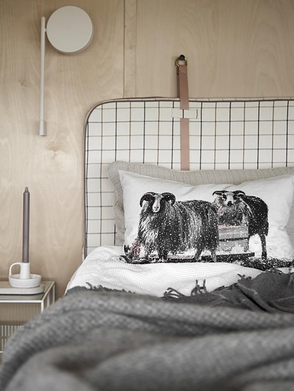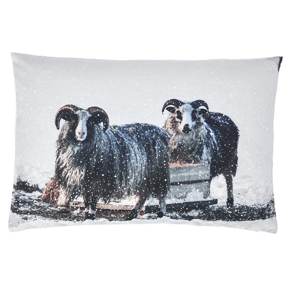 Bibbi kuddfodral från Boel & Jan med charmigt mönster av två får i snöigt vinterlandskap. Gör sig lika fin på soffan som sängen.