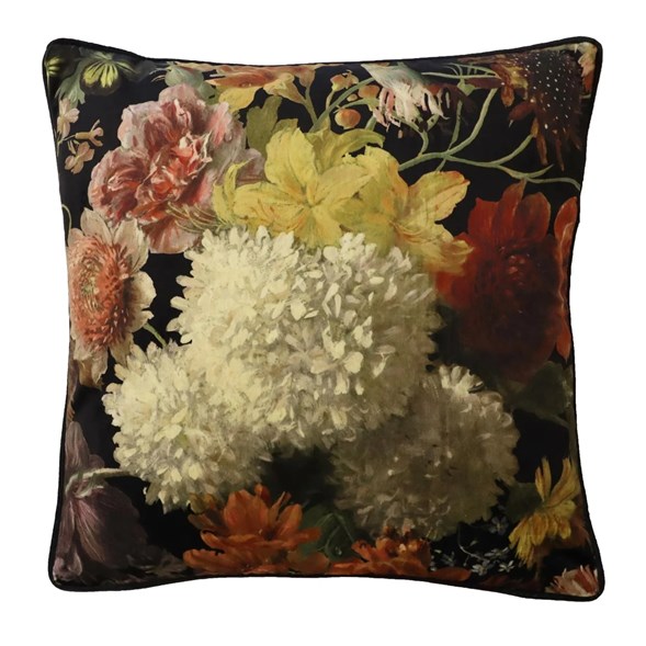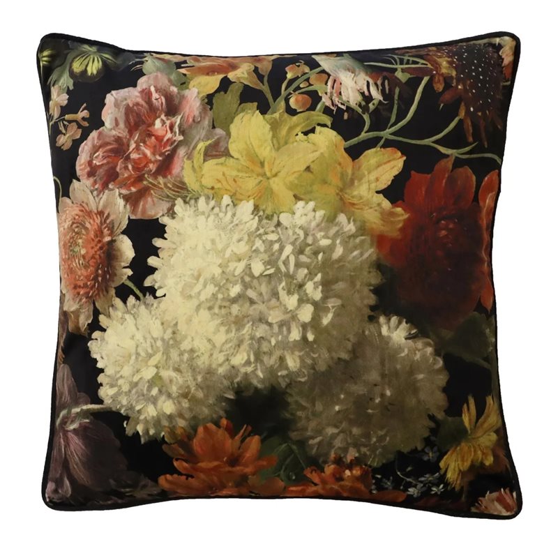 Vackert renässansinspirerat blommönstrat kuddfodral med skön sammetskänsla. Mönstret vilar på svart botten och fodralet har en dekorativ piping (passpoal) i svart runt hela fodralet. Dold dragkedja nertill.