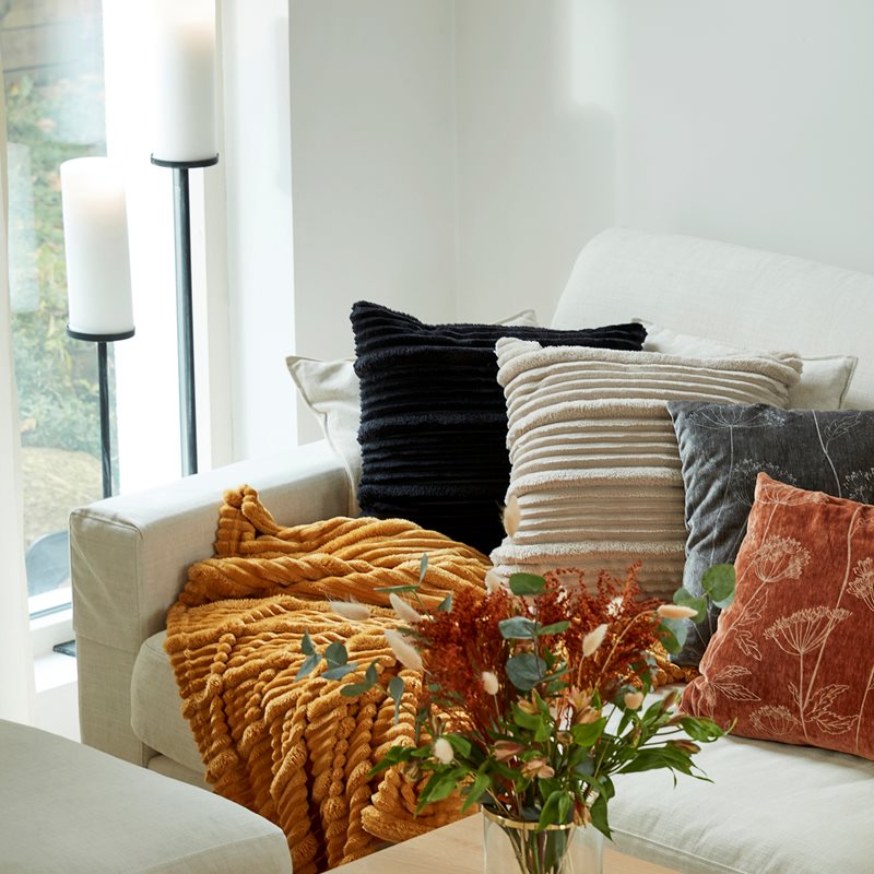 Härligt mjukt sandfärgat kuddfodral med vackra klippta ränder i relief som gör det helt oemotståndligt. Komplettera gärna med pläd i samma serie.