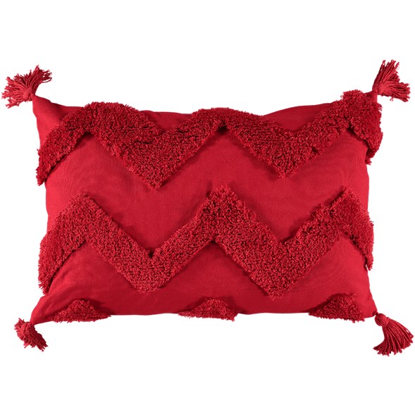 Dekorativt rött kuddfodral med tuftat zick-zackmönster.