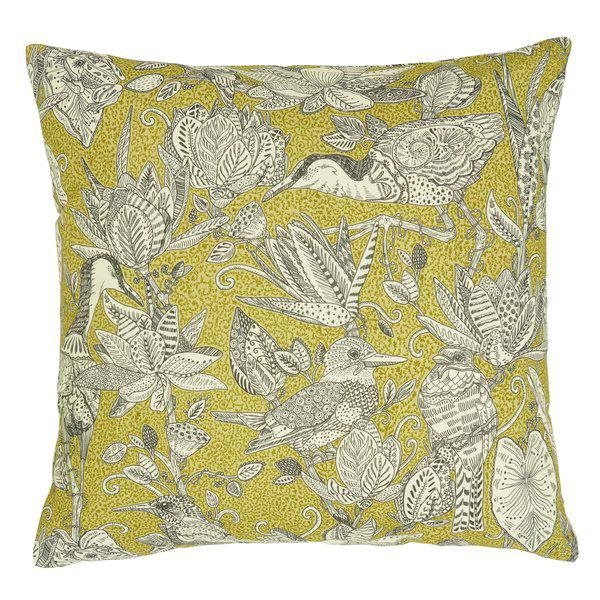 Vackert kuddfodral med ett svart-vitt & grått grafiskt fågelmönster på gul botten.